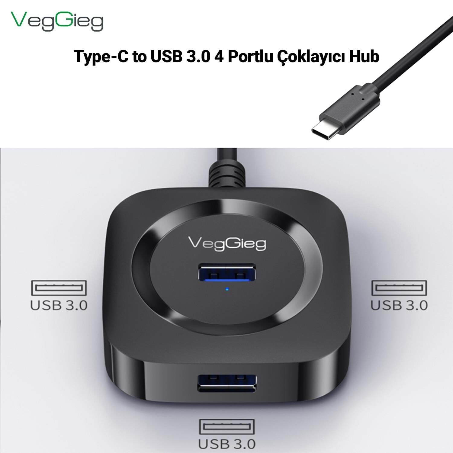 VegGieg 4 Portlu Type-C to USB 3.0 Çoklayıcı Hub Siyah, Type-C üzerinden bilgisayarınıza 4 adet USB 3.0 bağlantı noktası ekler. Bu sayede klavye, mouse, USB bellek ve HDD gibi USB cihazlarını aynı anda kullanmanıza olanak tanır. Micro USB (5V2A) dest