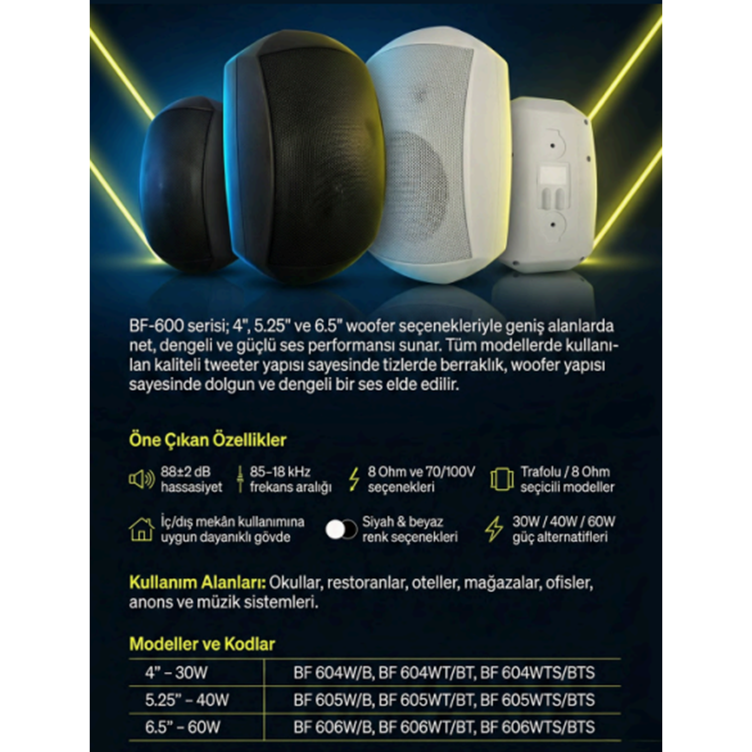 Ticari işletmelerin ve modern ofislerin mimari dokusunu bozmamak adına şık ve pürüzsüz beyaz renkte üretilmiştir. Beraberinde gelen pratik duvar montaj aparatı (braket) ile hoparlörün açısını kolayca ayarlayabilir, mekanın en kritik dinleme noktalarına (sweet spot) doğru sesi kusursuz bir şekilde yönlendirebilirsiniz.