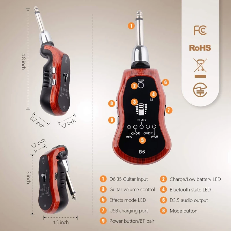 Arka plan müziği, Bluetooth aralığı 16 - 33 feet (açık hava) oynamak için Bluetooth fonksiyonu ile gitar kulaklık Amp. Uyarı: B6 Bluetooth cihazını arayamaz, bu yüzden diğer Bluetooth cihazlarıyla bağlantı kurmak için kullanılamaz; Arka plan müziği çalmak için b6'ün bluetooth'unu aramak ve bağlamak için sadece telefon/ped kullanabiliriz. B6 gitar ses ve müzik sinyalini gitar kulaklığına veya hoparlöre aktarabilir.