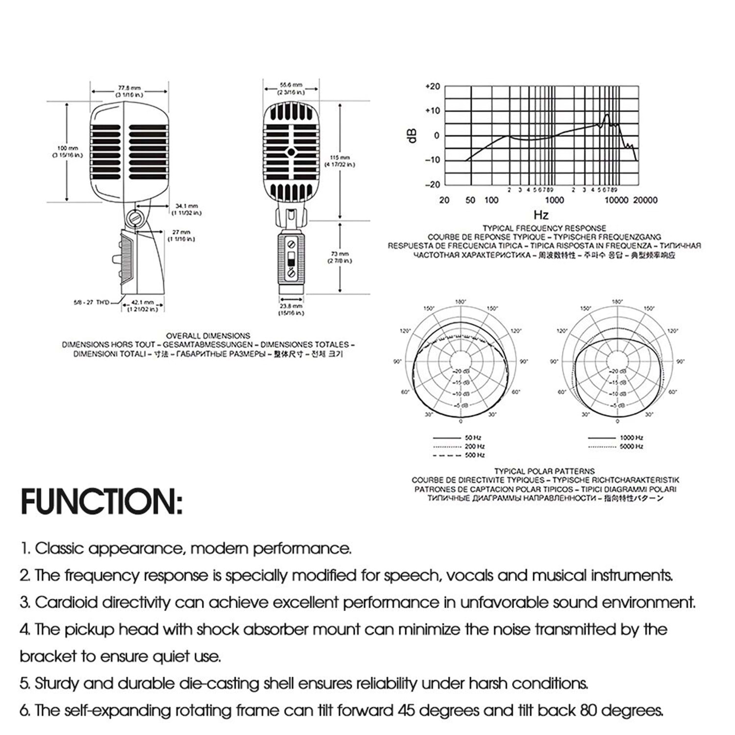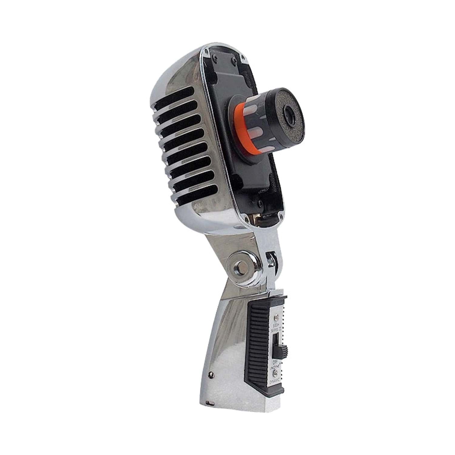 The 55SH II series has a low-impedance balanced output for connecting microphone inputs with a rated impedance of 75 to 300 ohms. The microphone uses a microphone head shock absorber to reduce the noise of the stand, and is equipped with an On/Off switch and an additional self-expanding 5/8"-27 threaded rotating stand.