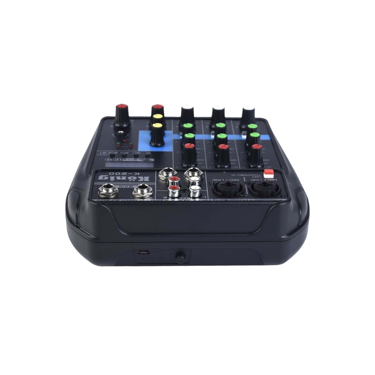 König K-200 deck mikser 4 kanallı, USB, Bluetooth ve echo özellikli +48 phantom güç sağlayabilen bir modeldir.