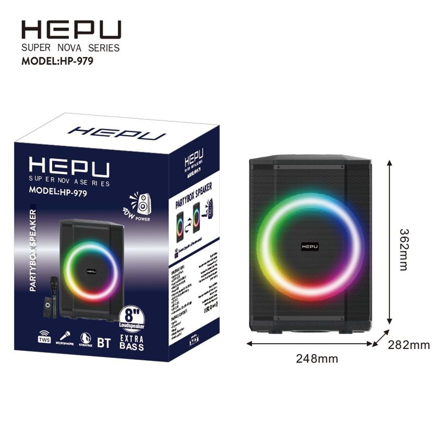 HEPU HP-979, Super Nova Series tasarımıyla 8 inç hoparlör yapısı ve 40W ses çıkışı sunan taşınabilir bir partybox hoparlördür. Extra Bass destekli yapısı sayesinde güçlü ve dengeli bir ses performansı sağlar. Ön yüzeyde yer alan RGB LED halka aydınlatma, müziğe uyumlu çalışarak ortama görsel bir şölen katar.