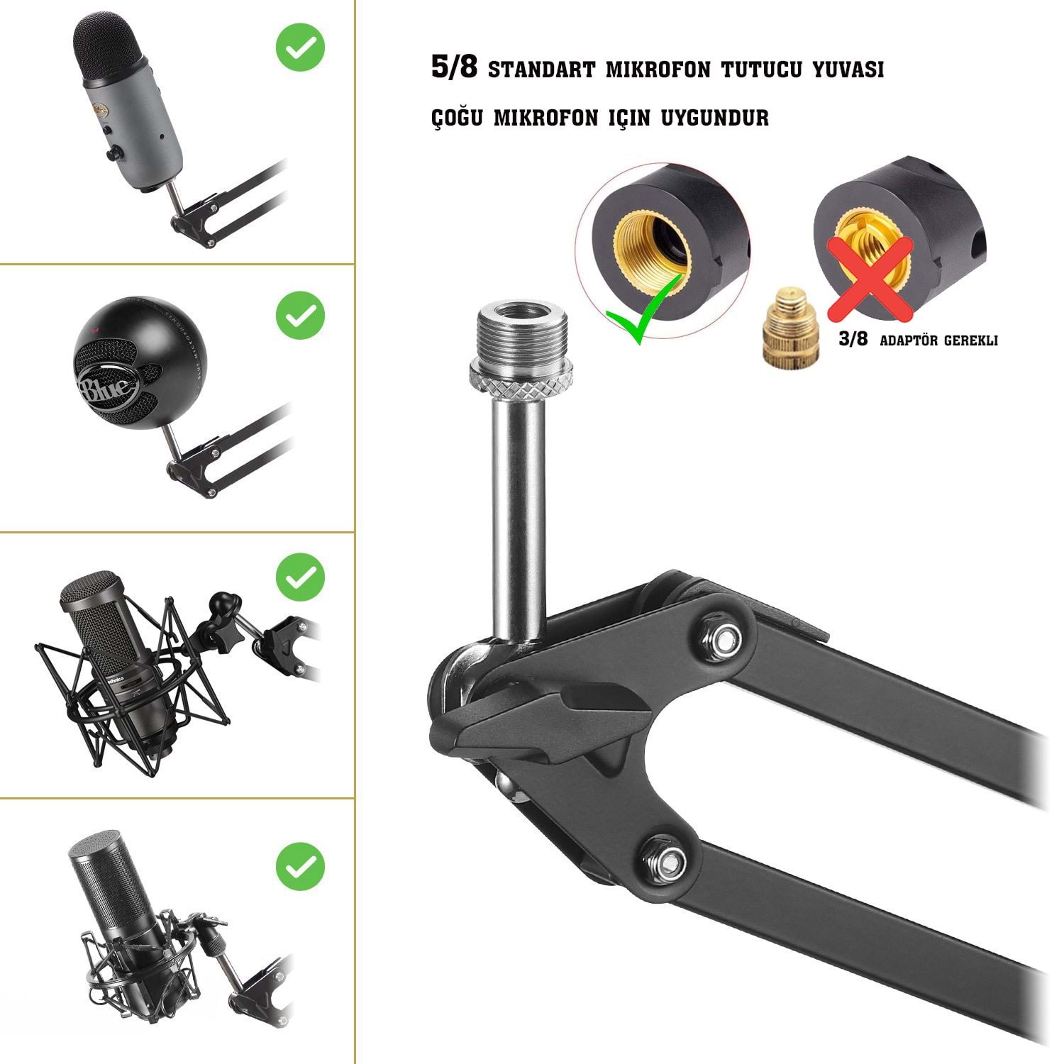 Günümüzün popüler Condenser veya dinamik mikrofonları için uygundur.