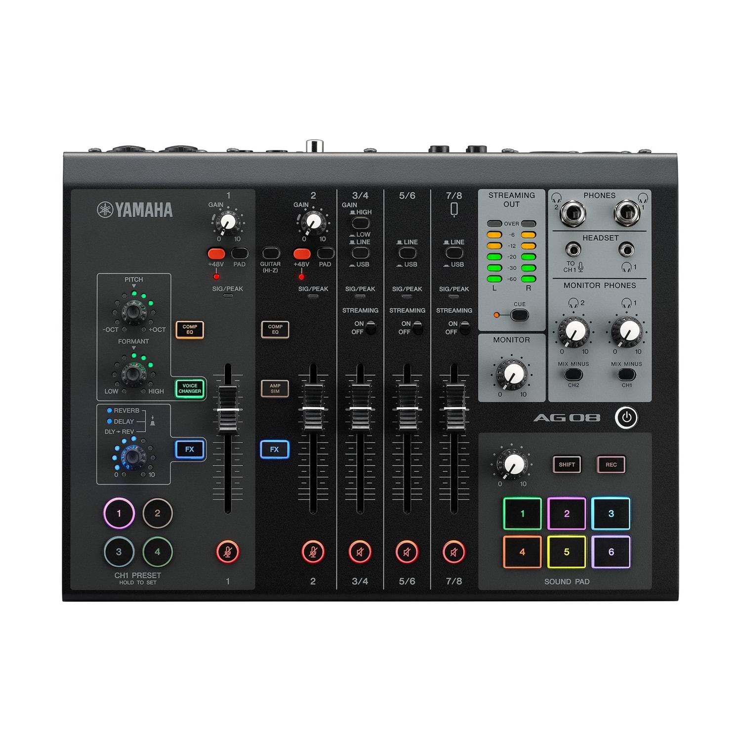 Yamaha AG08, 2 mikrofon girişi, gitar/hat girişi, USB kanalları ve çoklu çıkış opsiyonları ile tam kontrol sağlar. Gelişmiş ses yönlendirme, canlı yayın ve kayıt sırasında tüm kanalların bağımsız kontrol edilmesine olanak tanır.