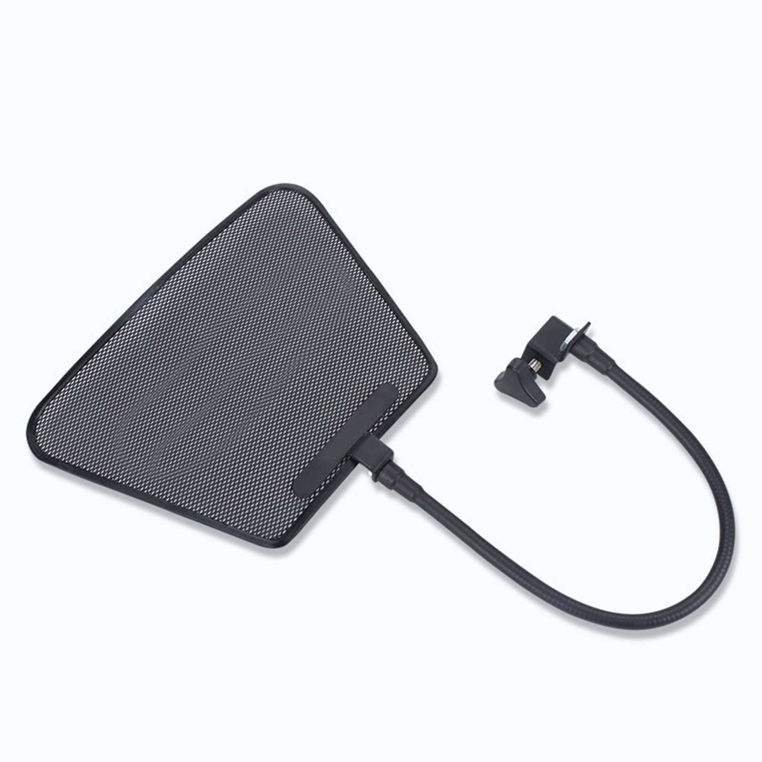 New metal screen mini pop filter, equipped with adjustable gooseneck and universal mounting plate for straight microphone stands.