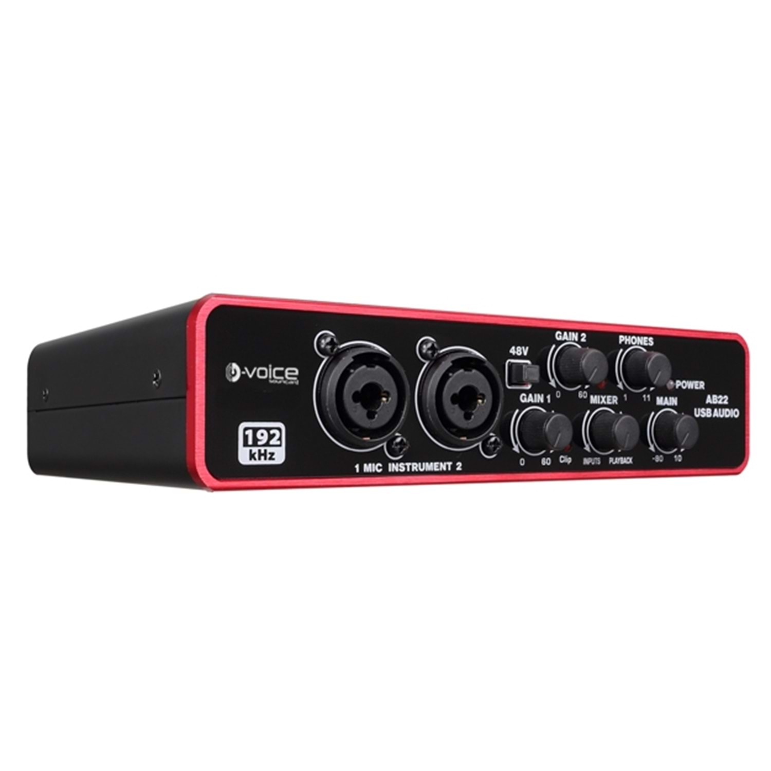 D-VOİCE AB22 USB A ve B giriş olarak 2 kanal XLR giriş desteklemektedir .XLR girişler +48 Pahontom desteğiyle Condenser mikrofonlarınızı extra bir güç kaynağına ihtiyaç olmadan kullanabilirsiniz.