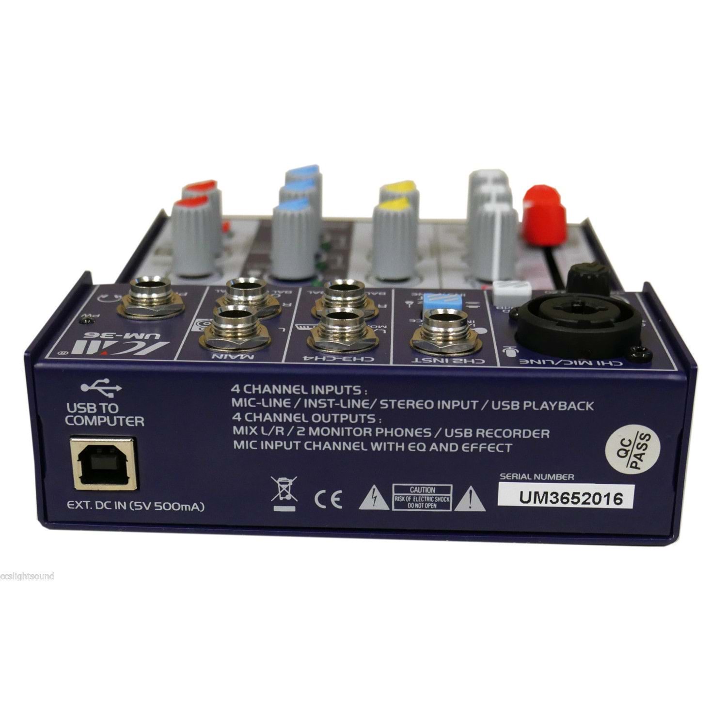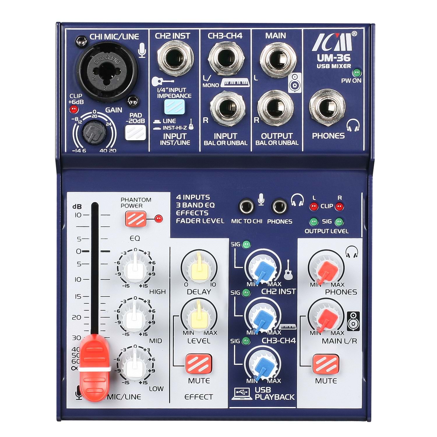 UM-36 4-channel USB powered mixer and interface. Balanced microphone input has phantom power, input gain control, 60mm fader, 3-way EQ and digital echo.