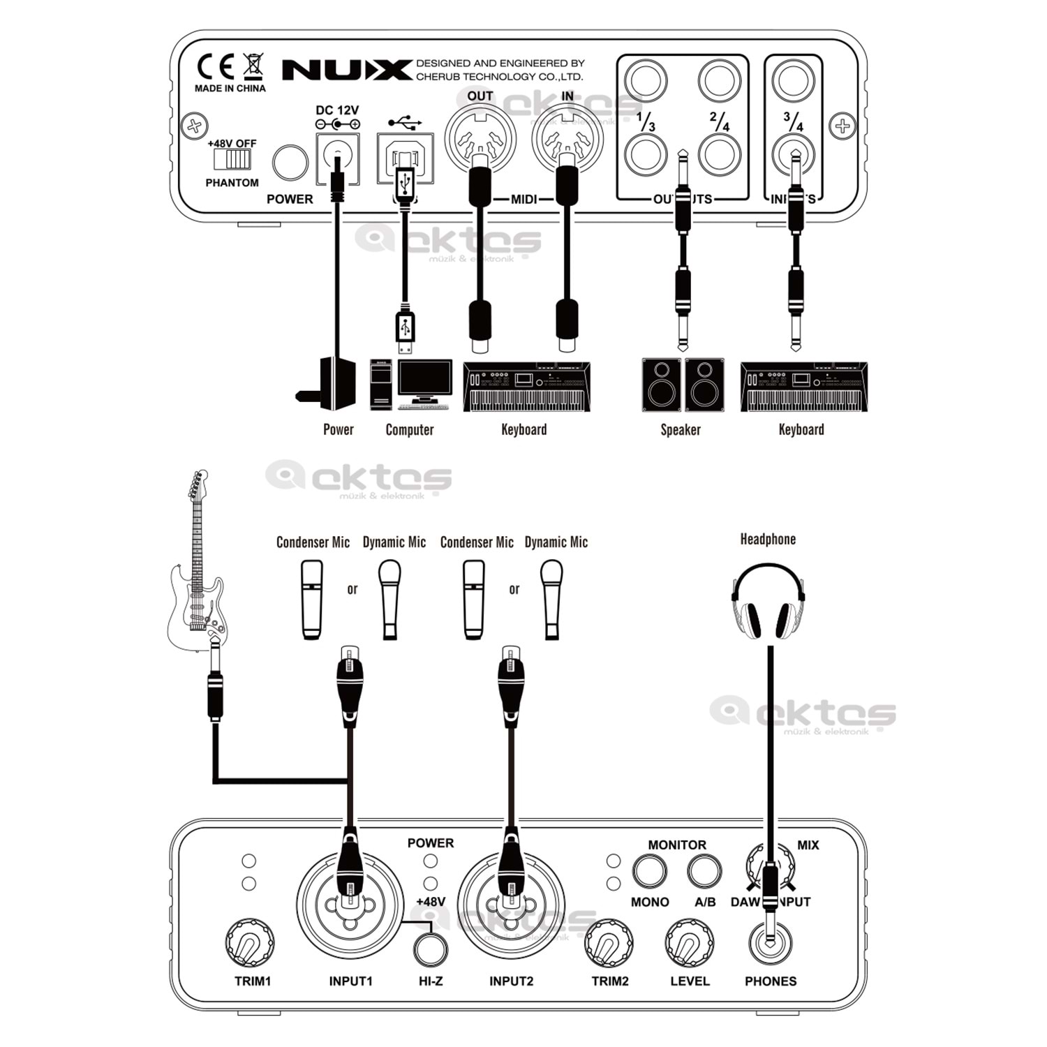Phantom power switch: sending 48V power to the front-panel XLR input for using with condenser mic.