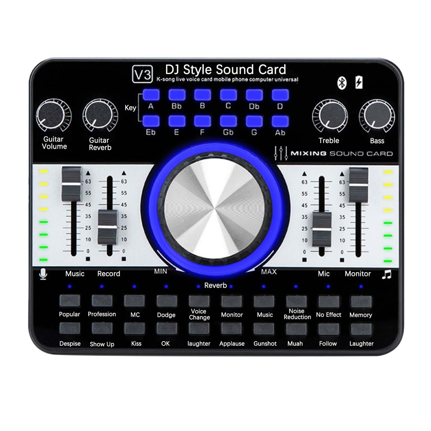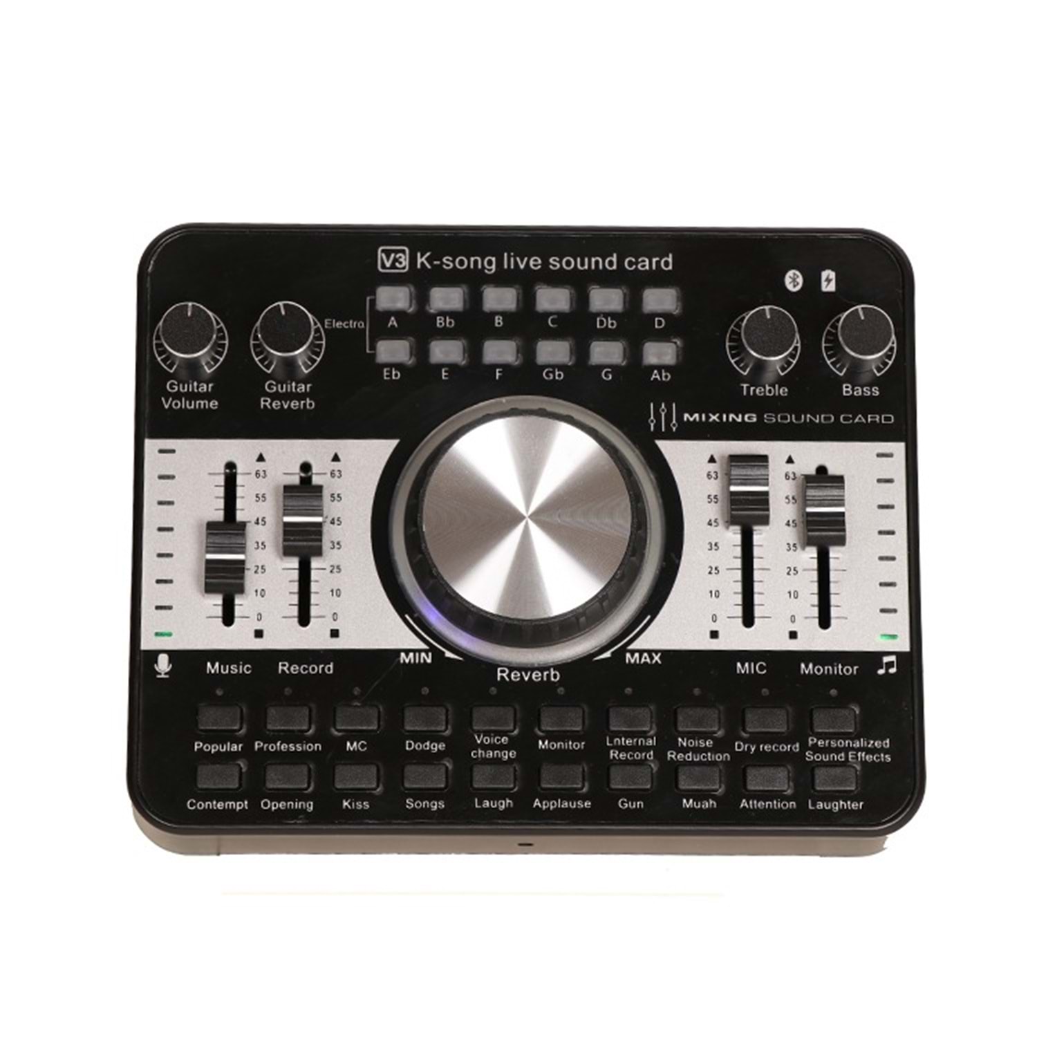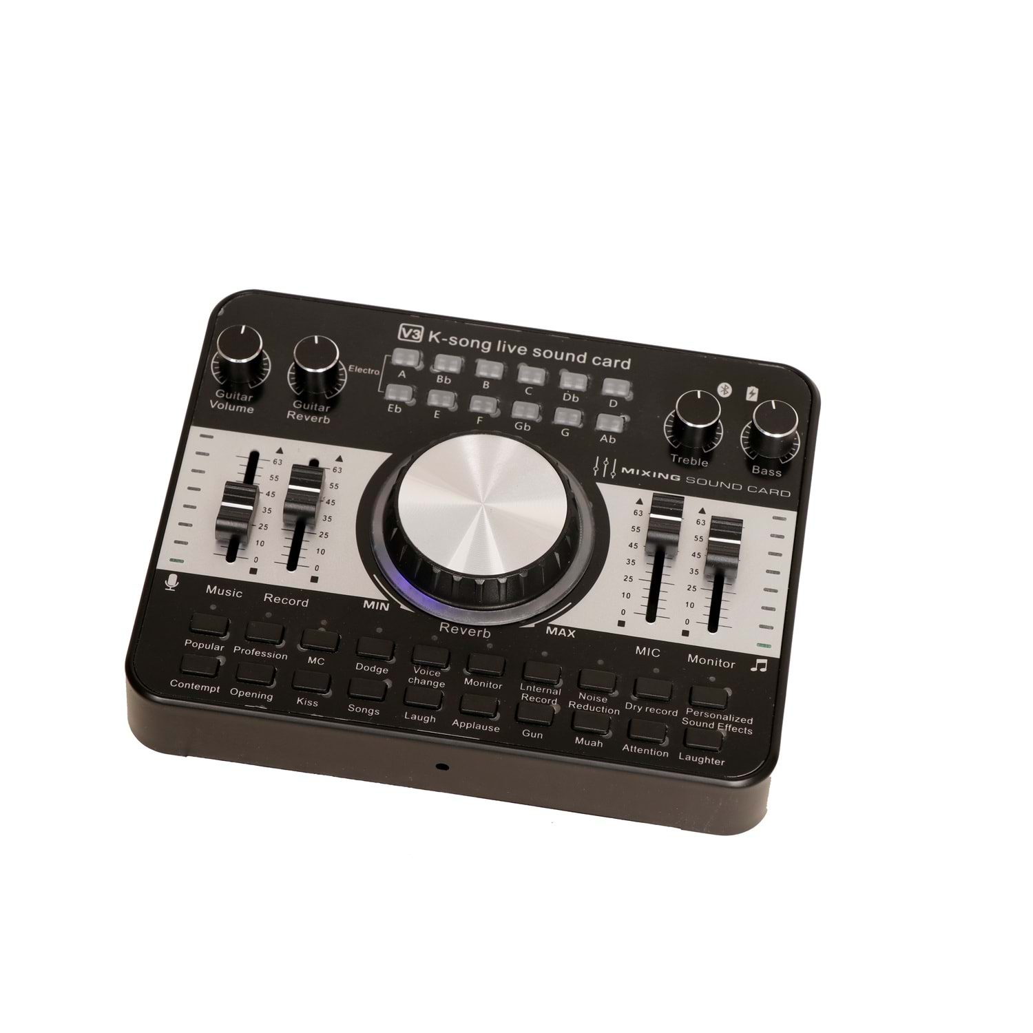 3. One-click selection of 12 kinds of electric tones and 5 kinds of sound changing effects 4. 9 effects volume adjustment(Reverb, treble, bass, recording, music, monitor, microphone, guitar volume, guitar reverb)