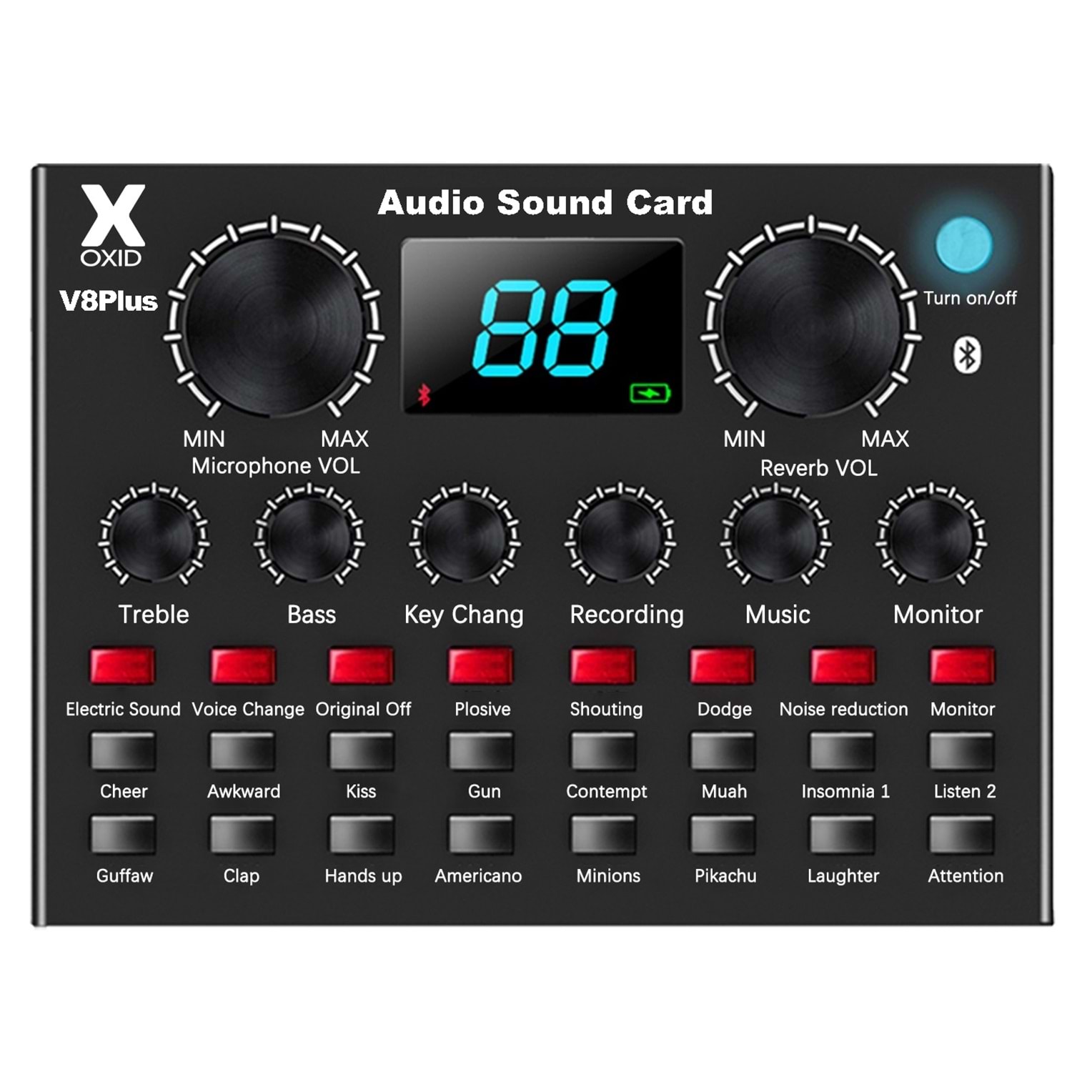 9 effects volume adjustment(Music, monitor, sound effect, treble, bass, recoding, key change, microphone, reverb)